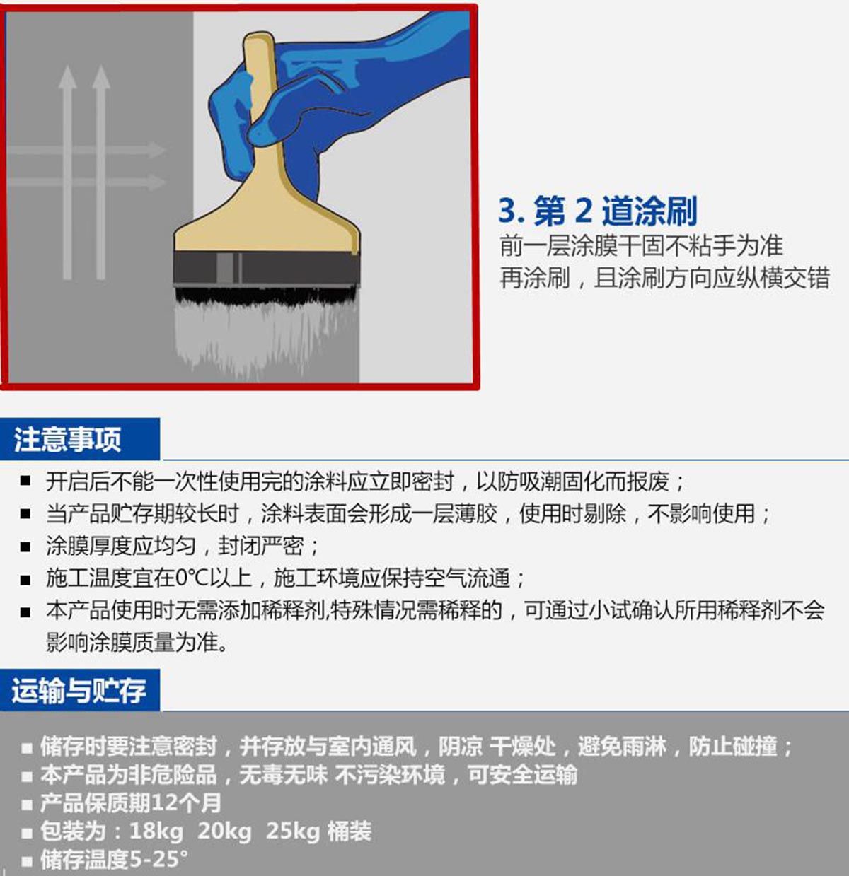 2、產(chǎn)品對(duì)不同的防水工程,不同的施工要求,采用2—4遍施工,必要時(shí)加胎基布處理。